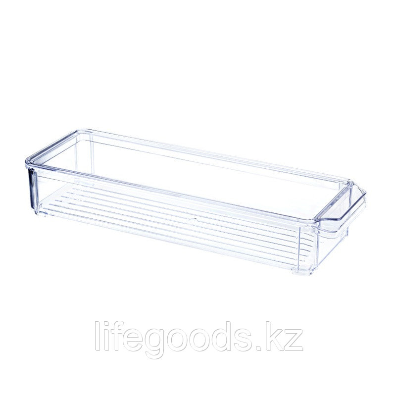 Контейнер изготовлен из прозрачного пищевого пластика, что позволяет легко видеть, что находится внутри, не открывая крышку. На передней панели расположена удобная ручка с выступом, благодаря которой органайзер легко выдвигается даже с загруженной полки.