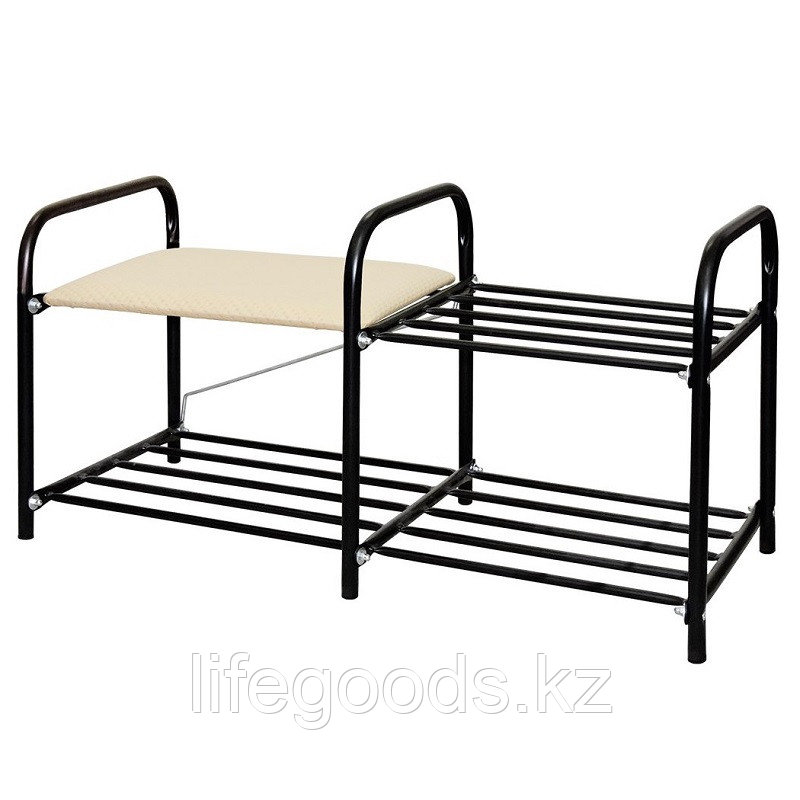 Этажерка имеет в основе усиленный металлический каркас с 2-мя ярусами полок для обуви и мягким сиденьем.